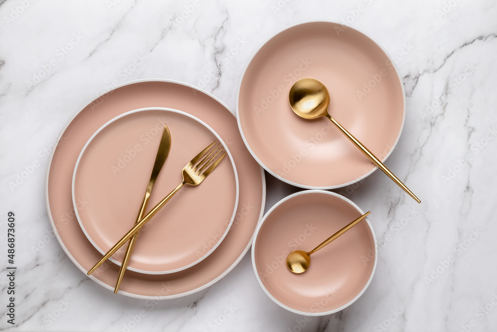 Dishes and utensils for serving and eating meals. Beige round Very well made.
