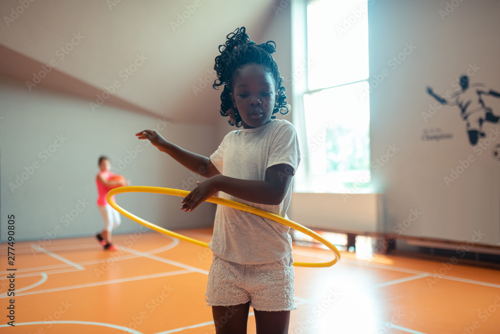 Concentrated schoolgirl twirling a hula hoop in the gym. Stock Very well made.