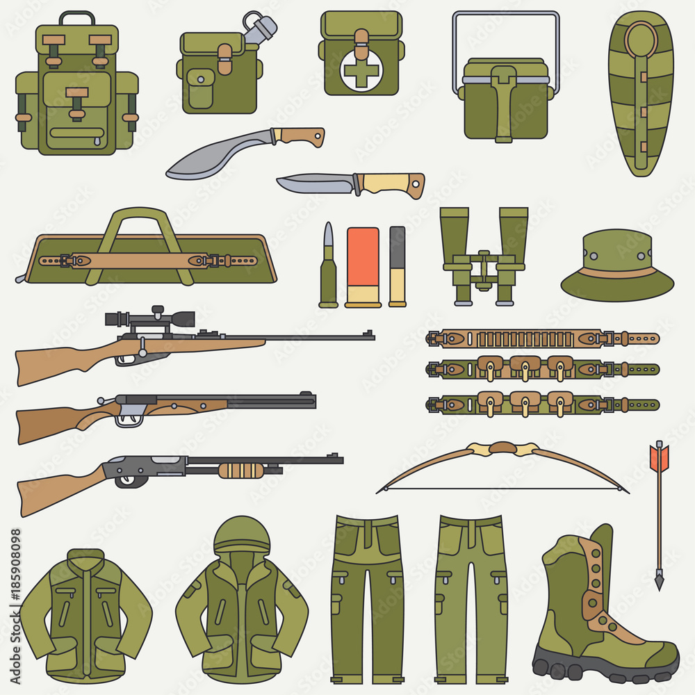 Line flat color vector hunt and camping equipment icon set. Hunter Very well made.